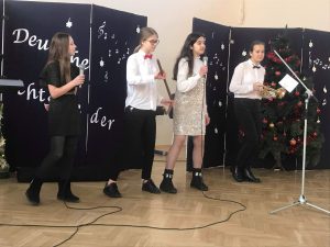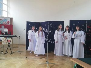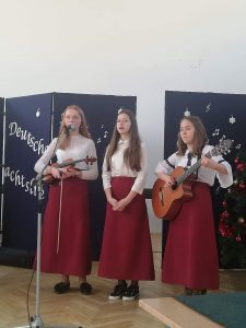 • am 18. Februar fand in unserer Schule der Wettbewerb “Deutsche Weihnachtslieder”für Schüleraus Grundschulen unseres Landkreises:  Zawoja Centrum, Zawoja Wilcznaj, Skawica, Wieprzec, Żarnówka Zachełmna, Bieńkówka und Jachówka. Die Veranstaltung wurde in zwei Kategorien durchgeführt: Solist und Gruppe. Unser Jury entschied über folgende Preise und Auszeichnungen: